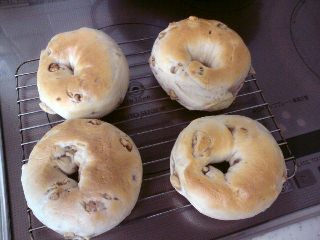 フランスパン用の粉を使ったせいか元々固いベーグル生地が一層固かったのと、くるみを混ぜ込んだので成形が大変だったのもありますが。(成形してる傍からくるみが生地から飛び出してくる)